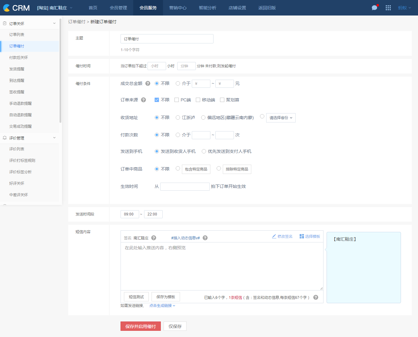 催付条件:设置好催付的条件之后,系统会自动根据设置好的条件发送催付短信。