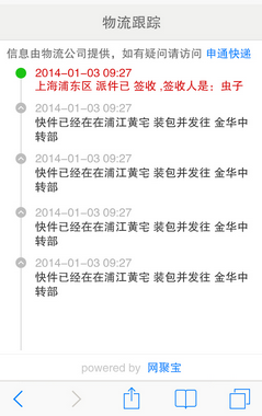 3、买家点击 物流跟踪 地址后,进入物流查询页面,进入该页面后会直接把买家包裹的物流流转情况显示出来,不需要买家再单独输入物流单号,如下为效果图;