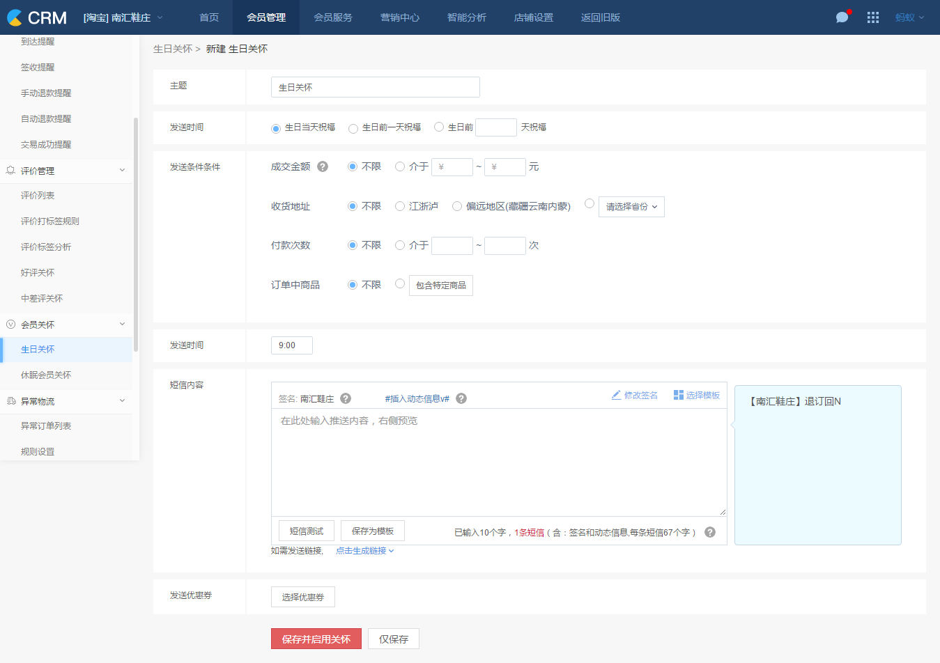 关怀时间:支持在会员生日当天发送祝福、或者生日前 X 天发送祝福;